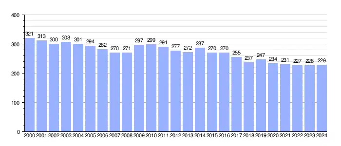 | Gráfica de evolución demográfica de Magaz de Arriba[5] entre 2000 y 2024 |
