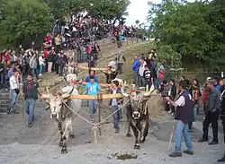 El sábado de Pentecostés, el festival comienza cuando los bueyes arrastran los robles, incluido el maggio y los postes para los cabrestantes, hacia el pueblo.[2]