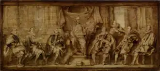Se identificó la pieza como un boceto preparatorio de Van Dyck para la obra Magistrados de Bruselas, de 1634-35, que fue destruida en el bombardeo francés de Bruselas de 1695.[3] Su composición se conoce a partir de un boceto en grisalla conservado en la Escuela de Bellas Artes de París (Los concejales de Bruselas alrededor de la estatua de la justicia), que Van Dyck preparó para mostrar cómo planeaba diseñar el trabajo, que consistía en un retrato colectivo de siete magistrados del consejo situados alrededor de una estatua representando a la justicia.[4]