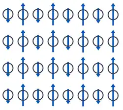 Incluso un acoplamiento antiferromagnético entre dos subredes de diferente momento magnético que no se cancelan completamente resulta en dominios magnéticos; se trata de sistemas, físicamente similares a los del caso anterior, llamados ferrimagnetos. Efectivamente, los ferrimagnetos también son imanes y pese a su origen dispar sus propiedades a primera vista son casi indistinguibles de las de los ferromagnetos. En la figura vemos un esquema simplificado, en el que las interacciones en cada línea son antiferromagnéticas, pero las columnas impares no compensan el momento magnético de las columnas pares. Todos los imanes permanentes —esto es, todos los imanes que no son electroimanes—, desde los bits de los discos duros a los imanes de nevera, pasando por las brújulas y por componentes clave de los auriculares y altavoces, son sustancias ordenadas ferromagnética o ferrimagnéticamente.