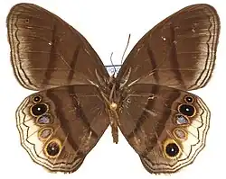 El tórax es color castaño oscuro, con líneas con aspecto de pelos en el abdomen; las alas miden en promedio 21,2 mm en los machos y 20,6 en las hembras; la coloración general de las alas es marrón con dos líneas verticales oscuras en cada ala claramente visibles en el dorso y más notorias en el dorso de las hembras, que tienen coloración más oscura en el vientre. Presentan ocelos rodeados de un anillo amarillo en la parte inferior de las alas posteriores dorsales, uno muy nítido en la parte ventral, negro con borde naranja y centro grisáceo. Tienen en el ala posterior un borde ancho blanco que se extiende desde los ocelos posdicales hasta el margen de las alas; también, dos puntos en los ocelos de la parte ventral de las alas.[1]