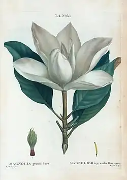 Magnolia grandiflora, de nombre común magnolia grandiflora, magnolia común o, simplemente, magnolia,[1] es una especie arbórea perteneciente a la familia Magnoliaceae, nativa del sureste de los Estados Unidos y norte de México; aunque se han tenido avistamientos in-situ en otras zonas de México. Es muy frecuente verla cultivada como planta ornamental.