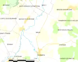 Malay es una comuna y población de Francia, en la región de Borgoña, departamento de Saona y Loira, en el Distrito de Mâcon y cantón de Saint-Gengoux-le-National.