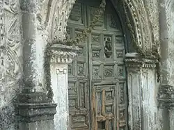 En una de las hojas de puerta se puede ver la talla de san Martín Caballero dando la mitad de su manto al mendigo y en la otra hoja se observa un deteriorado personaje a caballo que aplasta la cabeza de otra criatura. También en las puertas del edificio se encuentra tallada la fecha de 1765 y el nombre de los mayordomos y mandones que costearon los gastos.
