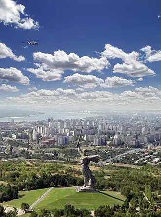 Tras el fin de la Segunda Guerra Mundial en Europa, las autoridades soviéticas planearon que el Mamáyev Kurgán se transformara en un monumento conmemorativo. El complejo fue construido entre 1959 y 1967 y se encuentra coronado por una estatua alegórica de la «Madre Patria» en su cima. En su base se encuentra enterrado el victorioso General de la defensa de la ciudad, el Mariscal de la Unión Soviética Vasili Chuikov, el único de ellos enterrado fuera de Moscú, así como Vasili Záitsev, francotirador al que se le atribuye haber dado muerte a 242 soldados y oficiales alemanes durante la Batalla de Stalingrado. Entre los españoles que yacen con él, se halla el teniente Rubén Ruiz Ibárruri, único hijo varón de La Pasionaria. Dentro del complejo se ubica también un gran museo sobre la batalla.
