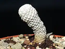 Es una planta perenne carnosa y globosa que crece aisladamente o con brotes en la base. Los tallos esféricos alcanzan un diámetro de 2 a 3,5 centímetros. Las areolas son cilíndricas, truncada en el extremo y están muy juntas. No contienen látex. Las espinas centrales no están presentes. Las 100 o más espinas radiales son como cerdas, de color blanco o gris y no todas son iguales, se irradian en sentido horizontal y se entrelazan, alcanzan un tamaño de 1 a 5 milímetros de largo. Las flores de color rosa alcanzan una longitud de 2 a 2,5 centímetros. Los pequeños, y casi esféricos frutos son blanquecinos y con semillas pardo negruzcas.