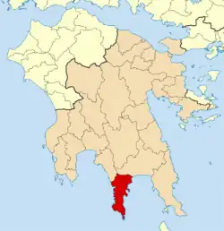 Se ubica en la península de Mani, que es la central de las tres penínsulas menores que sobresalen al sur del Peloponeso, separando el golfo de Mesenia del golfo de Laconia.[4]