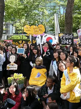 Las mujeres de confort que fueron forzadas a la esclavitud sexual durante la Segunda Guerra Mundial por los militares japoneses. El nombre oficial es manifestación regular para resolver los problemas de las mujeres de confort japonesas, y tiene lugar todos los miércoles en frente de la embajada japonesa en Seúl. Las protestas comenzaron en enero de 1992 y la manifestación celebró su quingentésima asamblea en marzo de 2002. Esta concentración es en este momento la manifestación más larga en torno a un tema unitario -los derechos humanos- que se ha realizado, y así figura desde 2002 en el Libro Guinness de los récords. Se llegó a la milésima reunión en 2011.[1]