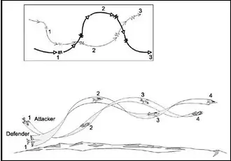 Pasar al defensor se denomina «sobrepaso de la línea alar». También llamado «sobrepaso de la línea 3-9» o «sobrepaso peligroso», se produce cuando un avión atacante se aproxima demasiado rápido y cruza accidentalmente la línea alar del defensor (una línea imaginaria que pasa por el centro del avión en las posiciones 3 en punto y 9 en punto). Un sobrepaso de la línea del ala se suele denominar «salir volando por delante» y provoca una «inversión de roles», lo que coloca al atacante al alcance de las armas del defensor, y el atacante se convierte de repente en el defensor.[44]