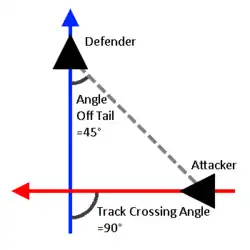 El TCA se define por la trayectoria real de ambos aviones, pero a menudo se estima mediante el ángulo de cruce de rumbo (HCA),[29] definido por el rumbo de la nariz de la aeronave atacante en relación con la nariz de la aeronave defensora. Las TCA se agrupan generalmente en tres categorías, denominadas «curvas de persecución». La «persecución en cabeza» se produce cuando el morro del atacante apunta por delante del defensor, mientras que la «persecución pura» se produce cuando el morro del atacante apunta directamente al defensor. Si el morro del atacante apunta por detrás del defensor, la condición se conoce como «persecución en cola».[23]