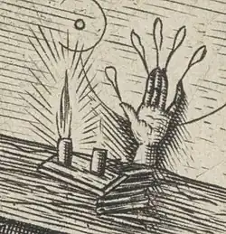 La Mano de Gloria también tenía supuestamente el poder de desbloquear cualquier puerta que se cruzara. El método de hacer una Mano de Gloria se describe claramente en el libro de Petit Albert Secrets merveilleux de la magie naturelle et cabalistique du petit Albert,[4][5] y en el Compendium Maleficarum.[6]