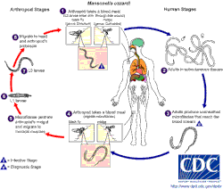 - Las larvas de la tercera etapa viajarán desde los músculos torácicos hasta la trompa del artrópodo. Esta es la etapa donde el artrópodo puede infectar a un humano cuando toma una comida de sangre.