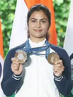 Manu Bhaker (Haryana, 18 de febrero de 2002) es una tiradora deportiva india. Representó a su país en la Copa Mundial ISSF en 2018 obteniendo dos medallas doradas, convirtiéndose en la deportista india más joven en conseguir dicha presea. Ganó además dos medallas doradas en los Juegos de la Mancomunidad de 2018.[1][2] En los Juegos Olímpicos de la Juventud 2018 celebrados en Buenos Aires, Argentina, Bhaker logró ganar una medalla dorada en la categoría pistola de aire comprimido 10 metros y una medalla de plata en la misma modalidad haciendo parte del equipo mixto internacional.[3]