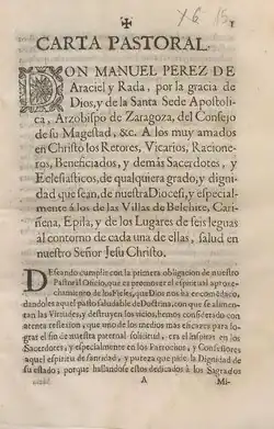 Dentro de su obra pastoral se conoce su carta pastoral, una epístola de diez páginas titulada "A losRetores, Vicarios, Racioneros, Beneficiados, y demás Sacerdotes, y Eclesiasticos ... de nuestra Diocesi", dirigida a las poblaciones de Belchite, Cariñena, Épila y sus alrededores.
