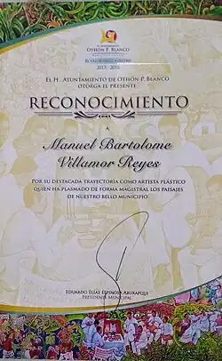 Reconocimiento otorgado a la trayectoria de Manuel Villamor, por el H. Ayuntamiento de Othón P. Blanco en 2015.