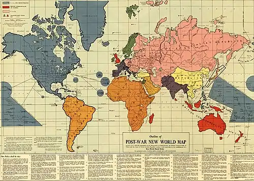 - Esta obra contiene una traducción parcial derivada de «Outline of the Post-War New World Map» de Wikipedia en inglés, publicada por sus editores bajo la Licencia de documentación libre de GNU y la Licencia Creative Commons Atribución-CompartirIgual 4.0 Internacional.