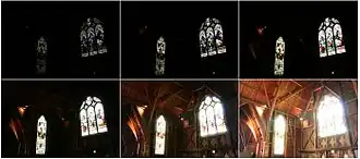 Las imágenes de la derecha muestran el interior de una iglesia, una escena que tiene una variación en el resplandor mucho mayor que la que se puede mostrar en un monitor o grabar con una cámara convencional. Las seis exposiciones individuales de la cámara muestran el resplandor de la escena en algún rango transformado al rango de brillos que se pueden mostrar en un monitor. El rango de resplandores registrados en cada foto es limitado, por lo que no se pueden mostrar todos los detalles a la vez: por ejemplo, los detalles del interior oscuro de la iglesia no se pueden mostrar al mismo tiempo que los de la vidriera brillante. Se aplica un algoritmo a las seis imágenes para recrear el mapa de radiación de alto rango dinámico de la escena original (una imagen de alto rango dinámico). Alternativamente, algunas cámaras digitales científicas especializadas y de consumo de gama alta pueden grabar una imagen de alto rango dinámico directamente, por ejemplo, con imágenes RAW.
