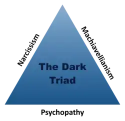 En 1998, a John McHoskey, William Worzel y Christopher Szyarto les pareció que el narcisismo, el maquiavelismo y la psicopatía eran términos más o menos intercambiables en muestras normales de población.[81] [82] Delroy L. Paulhus y McHoskey debatieron estas perspectivas en una conferencia de la Asociación Americana de Psicología, inspirando un conjunto de investigaciones que continúa creciendo en la literatura publicada. Delroy Paulhus y Kevin Williams encontraron suficientes diferencias entre los rasgos para sugerir que eran distintos a pesar de sus similitudes, por lo que se conceptualizó el concepto de una "tríada" de rasgos de personalidad repulsivos.[83] Se han realizado investigaciones sobre el maquiavelismo utilizando varias medidas de tríada oscura, incluidas la Tríada Oscura Corta (SD3) y la prueba de la Docena Sucia de la Tríada Oscura.[84] [85]