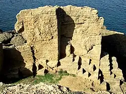 Las areniscas (calcoarenitas y eolianitas) están formada principalmente por pequeños fragmentos de fósiles con cementación caliza. Otras veces presenta mezcla de arenas y conchas fósiles, llegando a veces a encontrarse estratos puramente formados por conchas fósiles, de donde se obtienen piezas de gran belleza plástica y dureza (acopinyat). Estas arenas litorales se consolidaron en el período Cuaternario.