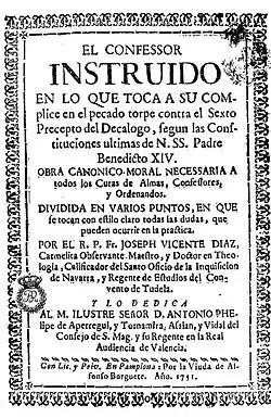 - ↑ El confessor instruido. Fr. Joseph Vicente Díaz. Pamplona, Viuda de Alfonso Burguete, 1751.
