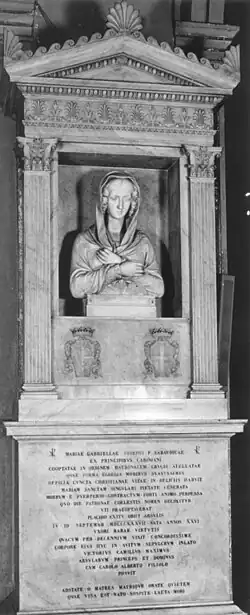 - ↑ El texto en latín de la inscripción reza: MARIAE GABRIELLAE IOSEPHI F. SABAUDICAE EX PRINCIPIBUS CARIGNANI COOPTATAE IN ORDINEM MATRONALEM CRUCIS STELLATAE QUAE FORMA EGREGIA MORIBUS SUAVISSIMIS OFFICIA CUNCTA CHRISTIANAE VITAE IN DELICIIS HABUIT MARIAM SANCTAM SINGULARI PIETATE VENERATAM MORBUM E PUERPERIO CONTRACTUM FORTI ANIMO PERPESSA QUO DIE PATRONAE COELESTIS NOMEN RECOLITUR UTI PRAEOPTAVERAT IV ID. SEPTEMBR. MDCCCXXXVII NATA ANNOS XXVI UXORI RARAE VIRTUTIS QUACUM PER DECENNIUM VIXIT CONCORDISSIME CORPORE EJUS HUC IN AVITUM SEPULCRUM INLATO VICTORIUS CAMILLUS MAXIMUS ARSULARUM PRINCEPS ET DOMINUS CUM CAROLO ALBERTO FILIOLO POSUIT