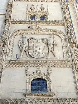 Iglesia de Nuestra Señora de la Asunción de Roa: En la villa burgalesa de Roa, lugar escogido como residencia por la duquesa en sus últimos años, se erige la iglesia de Nuestra Señora de la Asunción, ex-colegiata de la que María será una de las principales benefactoras. Aunque se desconoce en qué fecha se inició su construcción, sí se puede afirmar que Beltrán y María estuvieron implicados en la realización de esta fábrica. Escudo heráldico de la familia Velasco con tenante, situado en el muro exterior de la capillaTanto al interior como al exterior del edificio se despliega una gran secuencia propagandística del linaje de los Velasco, pues se encuentra representado el escudo del linaje hasta en cinco ocasiones, destacando la heráldica que rodea los diferentes muros del altar mayor y los escudos con tenantes ubicados en el muro exterior de la capilla mayor. María fue intitulada duquesa de Roa por el vínculo especial que mantenía con la villa y ella será la encargada de dotar y mandar construir la capilla mayor del principal edificio religioso ubicado en la misma. También dispondrá su propio sepulcro en la capilla mayor, que fue profanado y saqueado durante la invasión francesa pero que aún conserva restos calcinados en su interior, incluyendo un hueso que se cree perteneció a la duquesa. Originalmente, el sepulcro estaba adornado con estatuas de alabastro de don Beltrán y doña María, colocadas sobre un pedestal recubierto de chapa de oro, elementos que fueron sustraídos en aquella época. Actualmente no hay nada que nos indique que aquí se encuentra la sepultura de la duquesa y lo único que se conserva es una pequeña capilla decorada con elementos clásicos, con escasos restos de pintura mural y cierto deterioro de la piedra. En el frontis del sepulcro aún se conserva parte de una inscripción epigráfica que parece hacer referencia al enterramiento conjunto de María con su hija, la niña de los duques que falleció a temprana edad y de la que desconocemos su nombre.[25]