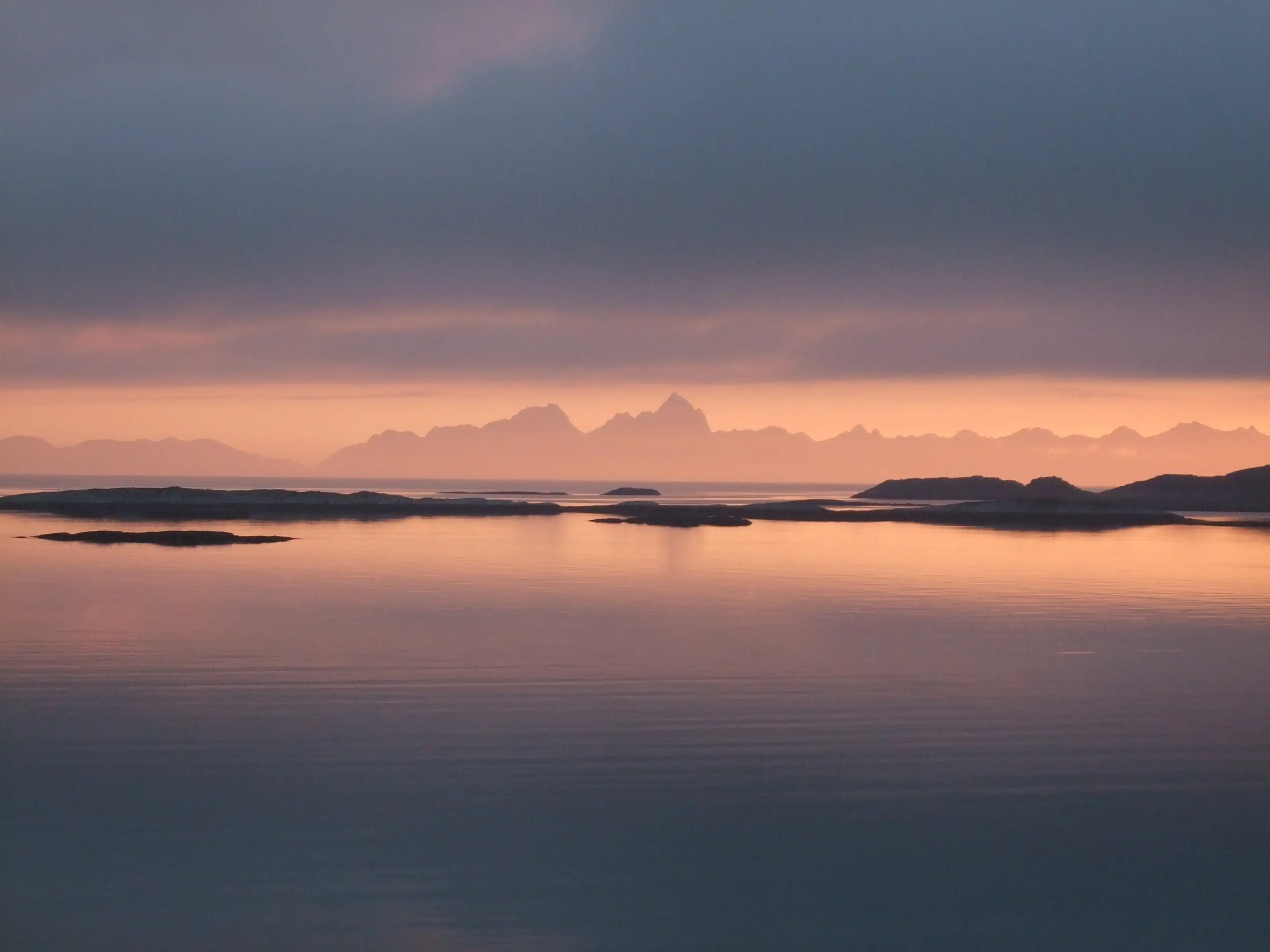 Atardecer en fiordo de Vestfjord, con las Lofoten al fondo. | ||