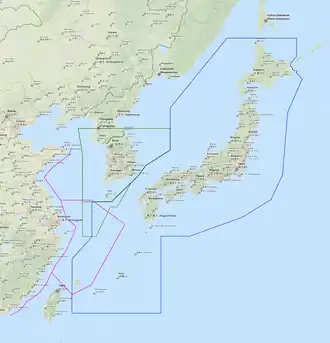 Provincias de Fujian, Zhejiang, Shanghái y Jiangsu (CHN) Provincias de Jeolla del Sur y Jeju (COR) Prefecturas de Fukuoka, Saga, Nagasaki, Kumamoto, Kagoshima y Okinawa (JAP) | |