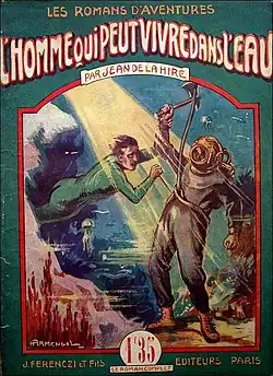 En 1908, Jean de La Hire publicó La Roue fulgurante (La rueda fulgurante), una novela que narra las aventuras de un grupo de terrícolas a quienes abduce una nave espacial y lleva a Mercurio y Venus. Este éxito lo convirtió en una figura destacada de la anticipación científica francesa de la preguerra.[33] Al dedicarse a la literatura popular lucrativa, continuó su incursión en el mundo de lo maravilloso científico con la exitosa serie de las aventuras de Léo Saint-Clair el Nictálopo y también publicó obras para un público juvenil, como Les Trois Boy-scouts (Los tres exploradores) y Grandes aventures d'un boy-scout (Las grandes aventuras de un explorador).[34]