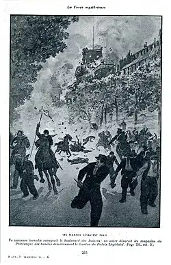 El pronóstico de un futuro conflicto también fue un tema recurrente de la anticipación. Hubo un primer acercamiento en la novela de Albert Robida La Guerre au vingtième siècle (La guerra del siglo XX, 1887)[4] antes de que el artista la tratara a profundidad en el semanario satírico La Caricature (La Caricatura) y luego en sus composiciones para La Guerre infernale (La guerra infernal, 1908), una novela de Pierre Giffard en el contexto de las «vísperas de una guerra». Las ilustraciones de Robida expresan el carácter especialmente mortífero e innovador de la guerra que se avecinaba (autos blindados, gases asfixiantes y máscaras de gas, obús gigantescos, torres de vigilancia antiaéreos, etcétera), sin caer por eso en un nacionalismo belicista propio de otros autores que se especializaron en este nicho, como el capitán Danrit, un militar y escritor francés,[64] con su tetralogía La Guerre de demain (La guerra del mañana, 1888-1896) y Albert Bonneau con su saga Les Samouraïs du Soleil pourpre (Los samuráis del Sol carmesí, 1928-1931).[4] Por último, esta anticipación puede tomar la forma de relato apocalíptico, como un cataclismo. En partícular, en La Force mystérieuse (La fuerza misteriosa, 1913), de J.-H. Rosny aîné, un espectro luminoso afectado por una perturbación cósmica desconocida provoca un ataque de locura temporal en el mundo entero y extermina a gran parte de la humanidad.[65] El astrónomo Camille Flammarion también trató el tema en La Fin du monde (El fin del mundo, 1893), texto que es al mismo tiempo una novela y un ensayo científico en que se debaten los distintos finales posibles del planeta Tierra.[66]