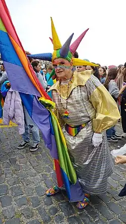 Roberto Acosta, activista LGBT, reconocido por ser el Arlequín que encabeza las marchas de la Diversidad y que fue declarado personaje ilustre de la ciudad de Montevideo.[1]