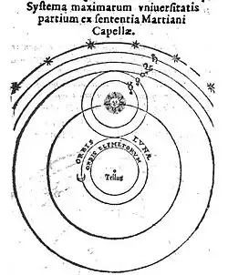 Representación del modelo astronómico geo-heliocéntico de Capela (por Naboth-1573).