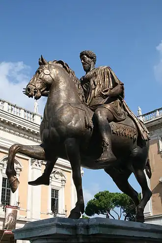 Existe una estatua ecuestre en bronce de Marco Aurelio que durante la Edad Media había permanecido en el Palacio de Letrán en Roma. En 1538 fue reubicada en la plaza del Campidoglio, en la Colina Capitolina. Actualmente, el original se encuentra dentro del Museo Capitolino, mientras en la plaza se exhibe una copia de la misma.