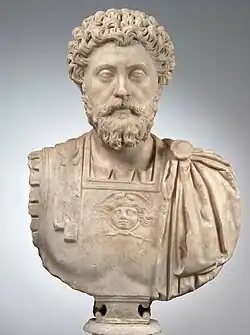 Marco Aurelio Antonino (en latín: Marcus Aurelius Antoninus; Roma, 26 de abril de 121[3]-Vindobona o Sirmio, 17 de marzo de 180[4]), conocido como Marco Aurelio, fue un emperador del Imperio romano desde el año 161 hasta el año de su muerte, en 180. Fue el último de los llamados Cinco Buenos Emperadores, tercero de los emperadores procedentes de una familia de antiguos colonos itálicos asentados en la provincia de Baetica,[5][6] y está considerado como una de las figuras más representativas de la filosofía estoica. Marco Aurelio y Lucio Vero fueron hijos adoptivos de Antonino Pío por mandato de Adriano, y fueron también coemperadores del Imperio.[7]