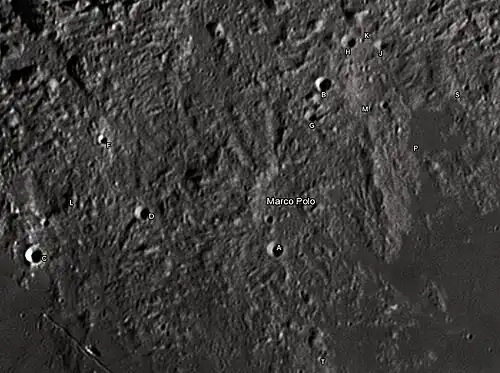 Por convención estos elementos son identificados en los mapas lunares poniendo la letra en el lado del punto medio del cráter que está más cercano a Marco Polo.