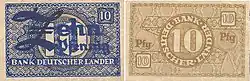 | 10 Pfennig | 1948-1949 | Latón depositado en acero | 21,50 | 4,00 | Rama de roble (Quercus robur) | Valor facial entre espigas de trigo | |
