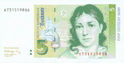 | 5 Marcos | Anverso: Retrato de una joven veneciana, basado en un cuadro de Alberto Durero (1505) Reverso: Hojas de roble |