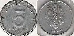 La primera serie de monedas emitidas en 1948 consistió valores de 1, 5, 10 Pfennig, todas estas de aluminio. Dos años después se agregó la moneda de 50 Pfennig, compuesta de Bronce de Aluminio.
