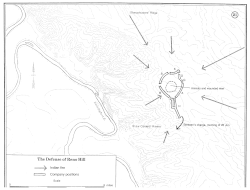 Pronto llegó Benteen. Al observar la situación, se dio cuenta de que este era "un lugar infernal para luchar contra los indios". Decidió que debían retirarse a su posición original, ahora llamada "sitio de defensa de Reno-Benteen" o simplemente "Reno Hill". Mientras tanto, el capitán McDougall había llegado al lugar con la caravana. El teniente Edward Mathey le dijo años después a Walter Camp que Reno los recibió sosteniendo una botella de whisky y gritando: "Todavía tengo media botella". McDougall encontró a Reno desorientado, tal vez sufriendo un shock, y ciertamente sin ningún interés en su precaria situación. Instó a Benteen a "tomar el control y dirigir la situación". Benteen estableció rápidamente un perímetro defensivo en forma de herradura en los acantilados cerca de donde él y Reno se habían encontrado antes. Fueron atacados inmediatamente y durante el resto del día.