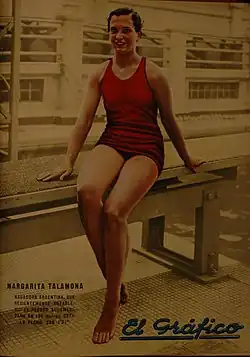 ![]() Margarita Talamona en la tapa de la revista El Gráfico del 30 de enero de 1937. Puede leerse: Margarita Talamona, nadadora argentina que recientemente estableció el record sudamericano en 100 metros estilo pecho con 1m31s. | ||