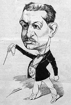 En 1876 es elegido director de la orquesta de la Sociedad de Conciertos de Madrid, apoyado por un grupo de maestros capitaneado por Víctor Mirecki. Desde esta plataforma, su labor de difusión de la música sinfónica alemana sería impresionante: ejecuta las nueve Sinfonías de Beethoven en versión integral, las primeras ocho en 1878; y la Novena, por vez primera en España, en 1882. Se convierte, asimismo, en uno de los introductores de Wagner en el panorama musical español. A fin de 1882, por la oposición a su programación recibida de ciertos maestros de la orquesta, abandona su cargo en la Sociedad de Conciertos y, con él, dejan dicha orquesta numerosos miembros. Ese mismo año gana la oposición de Conjunto Coral, plaza que ocupa, a partir de entonces, en el Conservatorio de Madrid.