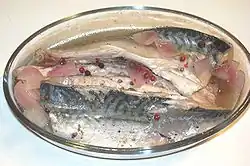 Los medios ácidos hacen que la trimetilamina (denominado a veces como óxido de trimetilamina u OTMA), causante del olor a pescado de algunos peces, reaccione con el agua y se convierta en una molécula no-volátil. Esto hace que los alcoholes de menos peso molecular dominen en los aromas finales.[5] Esta es una de las razones por las que el pescado marinado huele tan agradable, tal y como se puede comprobar en el arenque, el atún, el salmón, las anchoas, el bacalao y otros pescados.[6] Desde muy antiguo se ha reportado este tipo de marinado en los pueblos mediterráneos (Apicius[7]). Es muy frecuente en estas zonas mediterráneas este tipo de marinado en los escabeches, que procede de las costumbres árabes del sikbaj.[5] Los métodos combinados de marinado en pescados son práctica habitual en las culturas culinarias de la tierra. Los marinados de pescado, mariscos y cefalópodos realizados en medio ácido de zumo de cítricos dan lugar a diversos platos en América Latina: se denominan los cebiches.[8]