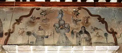Fresco del convento e iglesia de la Inmaculada Concepción de Ozumba (anónimo colonial).[5]San Francisco de Asís sostiene tres globos sobre los que se encuentra la Virgen, con la iconografía propia de la Inmaculada, Santa María de Agreda exhibe su Mística Ciudad de Dios, Duns Escoto hace lo propio con su defensa de la doctrina de la Inmaculada; volando, ocho querubines portan símbolos marianos (lirio, torre, escalera, pozo, sagrario, caja y otra flor). Provienen de una de las letanías marianas, la Letanía Lauretana: Estrella del Mar, Puerta del Cielo, Espejo sin mancha, Torre de David, Huerto Sagrado, Escalera de Jacob, Pozo de Sabiduría...[6]