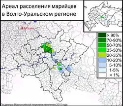 El total de población mari era de 670.900 (1989), 324.400 de los cuales habitan en Mari-El, 105.000 en Baskortostán, 44.500 en el óblast de Kírov, 31.300 en el óblast de Sverdlovsk y 19.500 en el Tataristán. La región que incluye la república de Mari El y partes del óblast de Nizhni Nóvgorod, el óblast de Kostromá y el óblast de Kírov se conoce como Marimlandia.