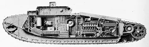 El duodécimo tripulante era el mecánico, sentado cerca del motor Liberty V-12 de 300 hp. Tres depósitos de combustible blindados en la parte posterior contenían 909 l de gasolina, que le otorgaban una autonomía de 89 km. La transmisión empleaba un engranaje planetario, teniendo dos velocidades hacia adelante y dos hacia atrás. La velocidad máxima era de 8 km/h.
