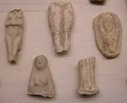 Sin embargo no son las obras en metal lo más importante y original del arte Marlik que ha llegado hasta nuestros días, sino sus coroplastías, en especial sus recipientes de terracota. Existe una serie de cerámicas antropomorfas, casi siempre se tratan de grandes vasos (de unos 50 cm de altura) que representan casi esbozadamente a mujeres y varones desnudos, las mujeres aparecen en actitud de plegaria, los varones son guerreros o portadores de ofrendas. Tal cerámica parece ser evidentemente funeraria, en rigor, prácticamente todo el arte Marlik se ha hallado en territorios, pero es muy probable que la cerámica zoomórfica fuera más utilitaria y se enterrara junto a sus dueños como parte de las ofrendas.[4]
