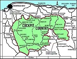 Otro pueblo maroon en el Cockpit Country, el interior montañoso de Jamaica, tuvo su origen en la fuga de Cufee de 1798. De origen akan, lideró un numeroso grupo de esclavos fugitivos de la segunda guerra cimarrón, que logró escapar a las expediciones de castigo de los maroons aliados del gobierno de Jamaica, originadas por los continuos ataques a las plantaciones.[17]Otros pueblos establecido al margen de los acuerdos entre los maroons y el gobierno de Jamaica fueron Healthshire o Me-no-Sen-You-no-Come. Los líderes de este último fueron Warren y Forbes, y se originó tras una fuga de esclavos en 1812 de las plantaciones de Trelawny. Perduró hasta la emancipación de los esclavos con la Slavery Abolition Act de 1833.[18][19][20]