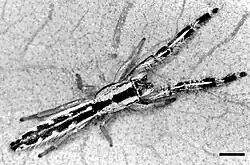 Posee una forma muy alargada, lo que le permite esconderse mientras se estira a lo largo de ramas o briznas de hierba. Descansa extendiendo sus dos primeros pares de patas por delante de su cuerpo y los dos pares restantes por detrás. Ambos sexos miden unos 8 mm de largo, excluyendo las patas. Mientras que el macho tiene una amplia franja mediana negra que se extiende por todo el cuerpo y las primeras patas anaranjadas y el caparazón anaranjado, la hembra tiene una coloración más apagada, con el abdomen de color crema pálido, moteado de negro.[4]