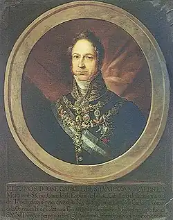 - José Gabriel de Silva-Bazán y Waldstein (18 de marzo de 1782-7 de noviembre de 1839), X marqués de Santa Cruz,[4] XII marqués del Viso, VII marqués de Arcicóllar, IX conde de Pie de Concha,[15] mayordomo mayor y sumiller de corps del rey Fernando VII.