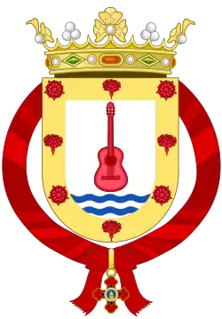 De merced nueva. Escudo en campo de plata, una guitarra española, de su color, puesta en palo, sobre ondas de azur y plata; bordura de oro, con cuatro rosas, de gules, y cuatro claveles, de gules, bien dispuestos, alternados.[3]